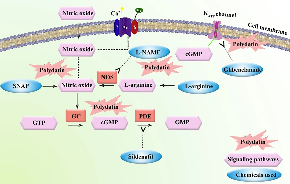 Polydatin (mixed cis and trans), ketorolac (KET), N(gamma)-nitro-l-arginine methyl ester (L-NAME: a NO blocker), sildenafil (a phosphodiesterase inhibitor), and glibenclamide (a KATP channel inhibitor) were all sourced from Sigma-Aldrich, St. Louis, Missouri, USA. Additionally, L-Arg (a NO precursor) and S-nitroso-N-acetylpenicillamine (SNAP; a NO donor) were obtained from Santa Cruz Biotechnology and Merck, respectively, both companies of the United States. Previous validation has been conducted on the effective doses as well as the methods of medical procedure administration (26-28).