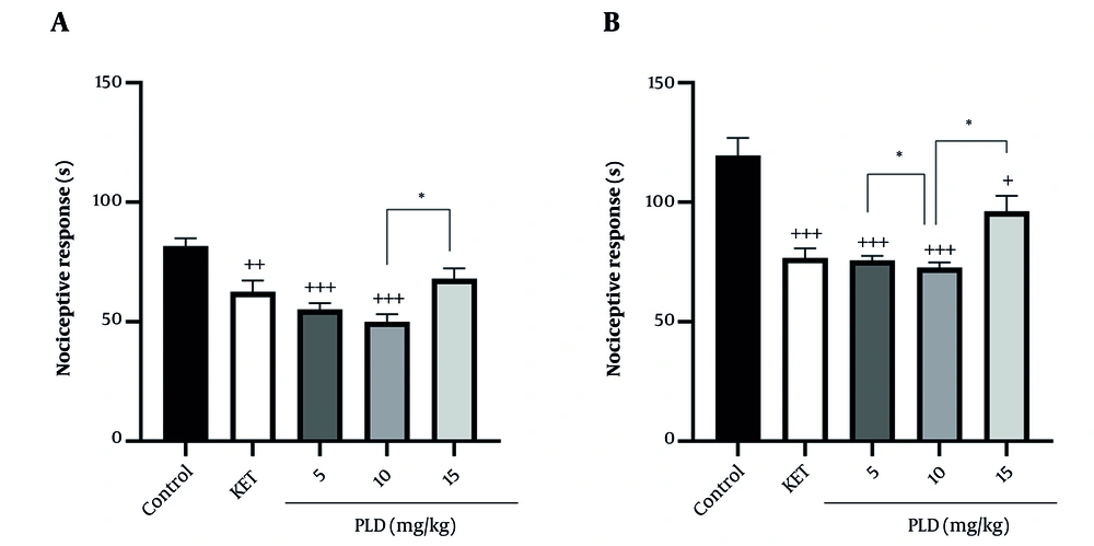 ![Response of three doses of polydatin [5, 10, 15 mg/kg, intraperitoneally (i.p.)] to formalin-induced pain in male mice during A, primary phase (5 minutes); and B, secondary phase (15 minutes; the data provided is presented as mean ± SEM employing one-way ANOVA and Tukey's test; n = 6; +P < 0.05, ++P < 0.01, +++P < 0.001 vs. control group, *P < 0.05 vs polydatin 10 mg/kg group; abbreviations: PLD, polydatin; KET, ketorolac). Response of three doses of polydatin [5, 10, 15 mg/kg, intraperitoneally (i.p.)] to formalin-induced pain in male mice during A, primary phase (5 minutes); and B, secondary phase (15 minutes; the data provided is presented as mean ± SEM employing one-way ANOVA and Tukey's test; n = 6; +P < 0.05, ++P < 0.01, +++P < 0.001 vs. control group, *P < 0.05 vs polydatin 10 mg/kg group; abbreviations: PLD, polydatin; KET, ketorolac).](https://services.brieflands.com/cdn/serve/3170d/d60ebb6a3a56a24bf8f05b3839e68291f975cf42/jjnpp-20-4-163665-i003-preview.webp)