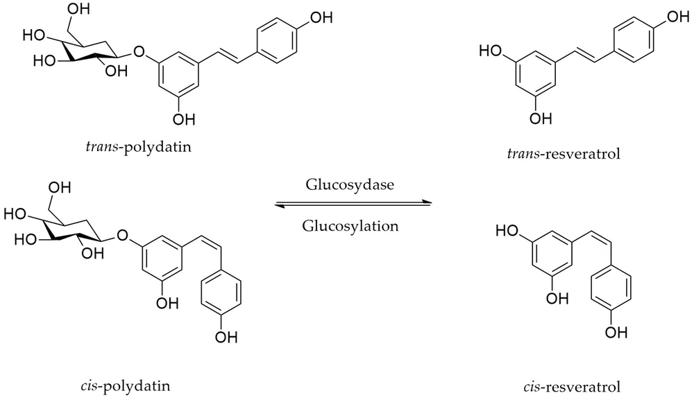 Grape juice and red/white wines represent the most prevalent origins of polydatin (12). Research has demonstrated polydatin’s therapeutic potential across a range of conditions, including various cancers, cardiovascular diseases, diabetes, neurological disorders, and both hepatic and respiratory diseases. Polydatin has also shown promise in managing gastrointestinal issues, infectious diseases, rheumatoid conditions, and skeletal/women's disorders (13). Moreover, polydatin has been shown to effectively suppress inflammatory processes, reduce oxidative stress, and prevent apoptosis (14, 15). Notably, it exhibits superior antioxidant (16) and anti-inflammatory (17) effects compared to resveratrol, along with enhanced biodistribution and intestinal absorption due to its sugar moieties (18). Pharmacokinetic studies employing sensitive analytical techniques such as liquid chromatography-tandem mass spectrometry (LC-MS/MS) and high-performance liquid chromatography (HPLC) have demonstrated polydatin’s improved biodistribution by accurately quantifying its absorption, plasma concentration, half-life, and bioavailability in vivo. Enhanced biodistribution indicates that polydatin is more efficiently absorbed, sustains longer circulation within the bloodstream, and achieves greater tissue penetration, which — together with its potent antioxidant properties — underpins its superior therapeutic efficacy (19, 20).