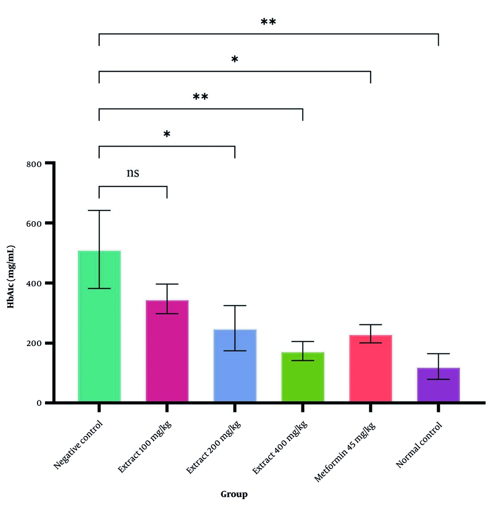 Diabetic rats were randomly assigned to five groups (n = 4 per group): (I) negative control (CMC-Na vehicle), (II - IV) treatment groups receiving the extract at 100, 200, and 400 mg/kg, respectively, (V) positive control (metformin 40 mg/kg), and one normal control group. Treatments were administered once daily for four weeks, and blood glucose levels were measured weekly. Dose selection was guided by traditional use, human-to-animal dose conversion, and previous research with modification (4, 13). All rats underwent an overnight fasting period at the termination of the experimental protocol, and their fasting blood glucose levels were measured using a glucometer (Easytouch GCU, Taiwan). Surgical incisions were made in the chest cavity, and blood samples were collected via cardiac puncture and centrifuged at 3,000 rpm for 10 min to isolate the serum. This serum was used to measure total cholesterol and triglycerides. The erythrocyte fraction was processed to prepare erythrocyte lysates (hemolysates), which were used for hemoglobin A1c (HbA1c). Pancreatic and gastrocnemius muscle tissues were harvested for histological and immunohistochemical analysis.