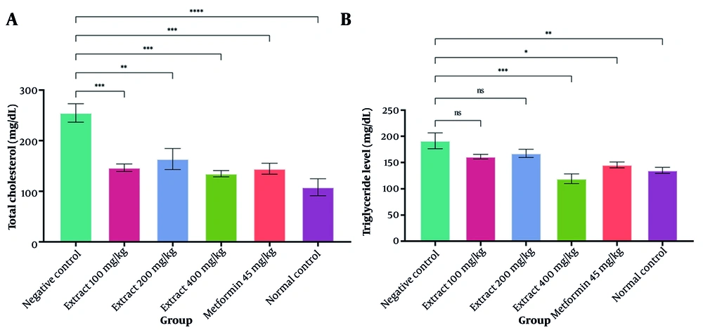 As illustrated in Figure 6, both the extract and metformin significantly lowered total cholesterol levels relative to the negative control group (P < 0.05). Administration of various extract doses did not significantly differ between the dose groups (P > 0.05). The total cholesterol levels in the extract groups at 100, 200, and 400 mg/kg doses were the same as those in the positive control group (P > 0.05). Administration of 400 mg/kg resulted in a significant reduction in triglyceride levels when compared with the untreated diabetic group (P < 0.05). In addition, increasing the extract dose significantly reduced triglyceride levels.