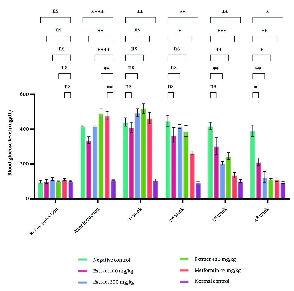 Effect of Saurauia bracteosa extract administration on blood glucose levels of rats during 4 weeks of treatment. For each group, the data are presented as mean ± standard error of the mean of four replicates. (Abbreviation: Ns, not significant; *P < 0.05; **P < 0.01; ***P < 0.001; ****P < 0.0001)