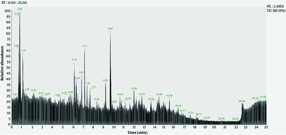 Liquid chromatography-high resolution mass spectrometry (LC-HR MS) analysis of the ethanol extract of S. bracteosa leaves can be seen in Figure 1 and Table 1.