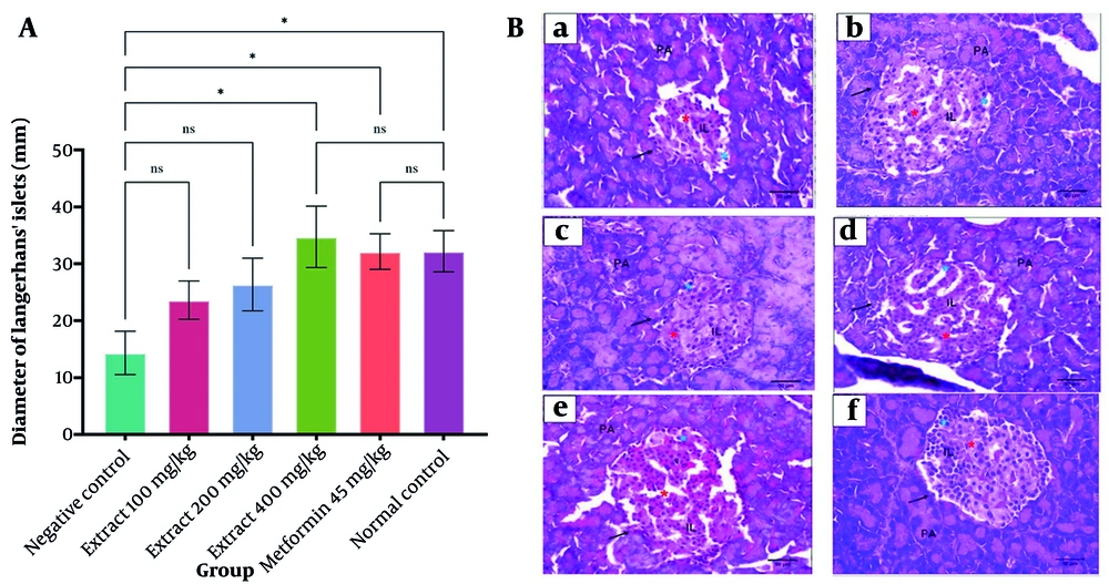 A, effect of Saurauia bracteosa extract on the diameter of Langerhans’ islets. For each group, the data are presented as mean ± standard error of the mean of ten replicates; B, effect of Saurauia bracteosa extract on the diameter of Langerhans islets at magnification 40 × 10; a, negative control, b, extract dose of 100 mg/kg; c, extract dose of 200 mg/kg; d, extract dose of 400 mg/kg; e, positive control (metformin 45 mg/kg); and f, normal control. (Abbreviation: Ns, not significant; PA, pancreatic acinar; IL, islet of Langerhans (blue star (alpha cells); red star (beta cells); black arrow (cell membrane), *P < 0.05)