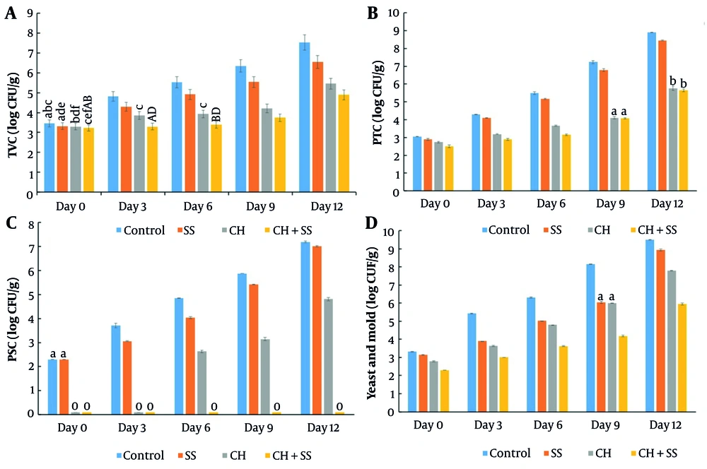 ![Microbial dynamics in trout fillets during 12-day storage at 4°C: A, total viable count (TVC); B, psychrotrophic bacteria count (PTC); C, <i>Pseudomonas</i> count (PSC); and D, yeast and mold count [data represent mean ± SD for control, chitosan (CH), <i>S. striata</i> extract, and CH film incorporating with <i>S. striata</i> extract (CH+SS) treatment groups (log CFU/g). Lowercase letters indicate no significant difference between treatments; capital letters indicate no significant difference between storage days within the same treatment; P > 0.05]. Microbial dynamics in trout fillets during 12-day storage at 4°C: A, total viable count (TVC); B, psychrotrophic bacteria count (PTC); C, <i>Pseudomonas</i> count (PSC); and D, yeast and mold count [data represent mean ± SD for control, chitosan (CH), <i>S. striata</i> extract, and CH film incorporating with <i>S. striata</i> extract (CH+SS) treatment groups (log CFU/g). Lowercase letters indicate no significant difference between treatments; capital letters indicate no significant difference between storage days within the same treatment; P > 0.05].](https://services.brieflands.com/cdn/serve/3170d/9e35b3d39d4d583e1f14dca61bac07be9382de57/jjnpp-20-4-165986-i002-preview.webp)
