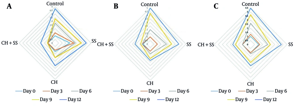![Sensory evaluation of trout fillets during 12-day storage at 4°C: A, color scores; B, odor scores; and C, texture scores [data represent mean ± SD of sensory for control, chitosan (CH), <i>S. striata</i> extract, and CH film incorporating with <i>S. striata</i> extract (CH+SS) treatment groups]. Sensory evaluation of trout fillets during 12-day storage at 4°C: A, color scores; B, odor scores; and C, texture scores [data represent mean ± SD of sensory for control, chitosan (CH), <i>S. striata</i> extract, and CH film incorporating with <i>S. striata</i> extract (CH+SS) treatment groups].](https://services.brieflands.com/cdn/serve/3170d/bc9addbefb60fc93cab1dabf97d9fc55ab714eb9/jjnpp-20-4-165986-i004-preview.webp)