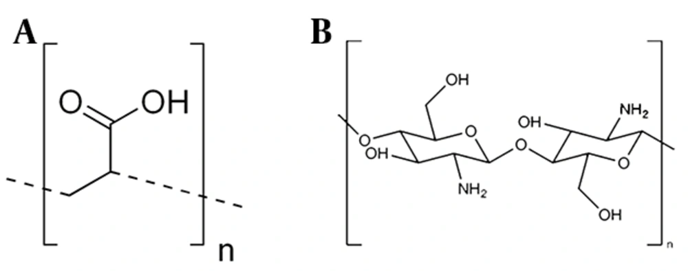 Chitosan is a natural cationic biopolymer and linear polysaccharide composed of N-acetyl-D-glucosamine and D-glucosamine units connected by β-1,4-glycosidic linkages. Obtained from chitin through demineralization and deproteinization, it has an extensive array of medical and agricultural applications (16). Chitosan has functional groups strategically placed to provide these unique polysaccharide qualities (17). An amino group enhances Chi’s functional and structural features at the C-2 position of the glucosamine unit. This amino group is responsible for its cationic nature and confers antibacterial action. This polymer has biocompatibility and nontoxicity, but its poor mechanical properties and the difficulty in electrospinning have led to it being reinforced with synthetic polymers (18, 19).