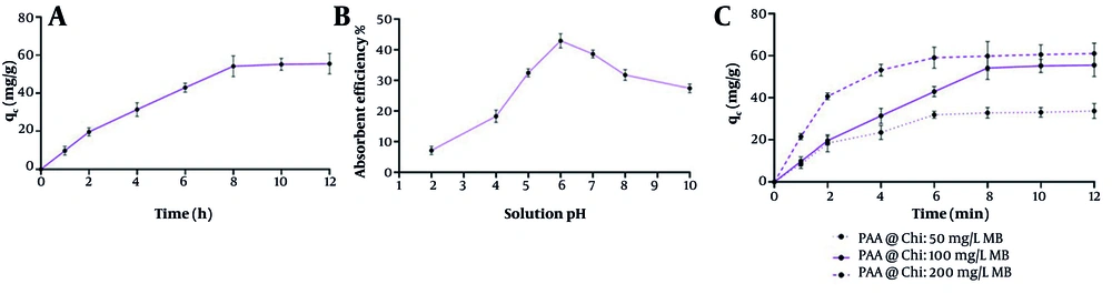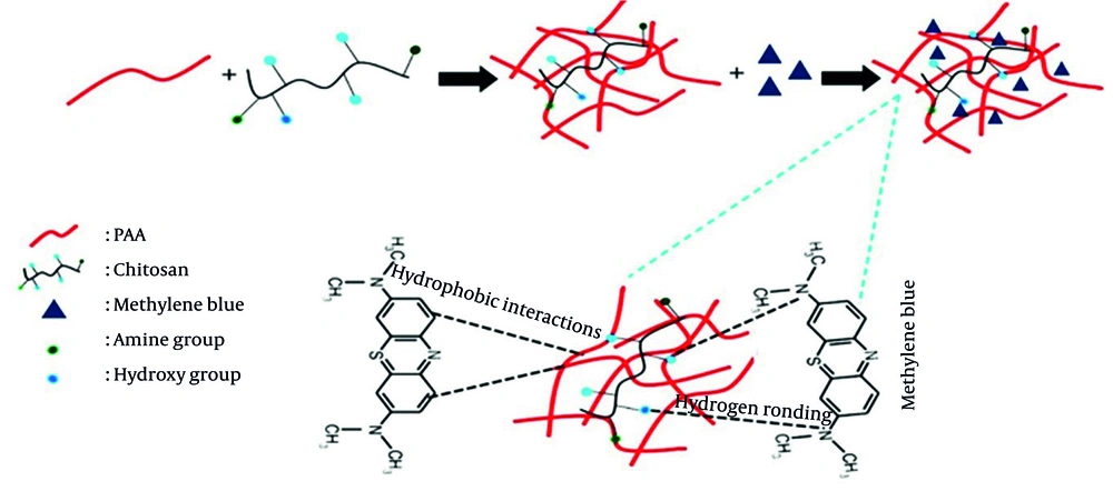 The obtained results of adsorption show that the hybrid network of PAA and Chi exhibits high efficiency in removing MB dye from aqueous media. This performance is attributed to the three-dimensional polymeric network formed through the physical interpenetration of the two polymer chains (37). The amine (-NH2) and hydroxyl (-OH) groups of Chi and the carboxyl (-COOH) groups of PAA are central to the adsorption process (37, 38). These groups facilitate strong bonding of MB molecules via hydrogen bonds, while the negatively charged carboxyl groups and the positively charged dye interact through electrostatic attraction. Additionally, adsorption is further stabilized by hydrophobic interactions between the aromatic nuclei of MB and the non-polar regions of the network (39, 40). The main interactions between the dye and the adsorbent — hydrogen bonding and hydrophobic interactions — indicate a multimodal adsorption mechanism (39).