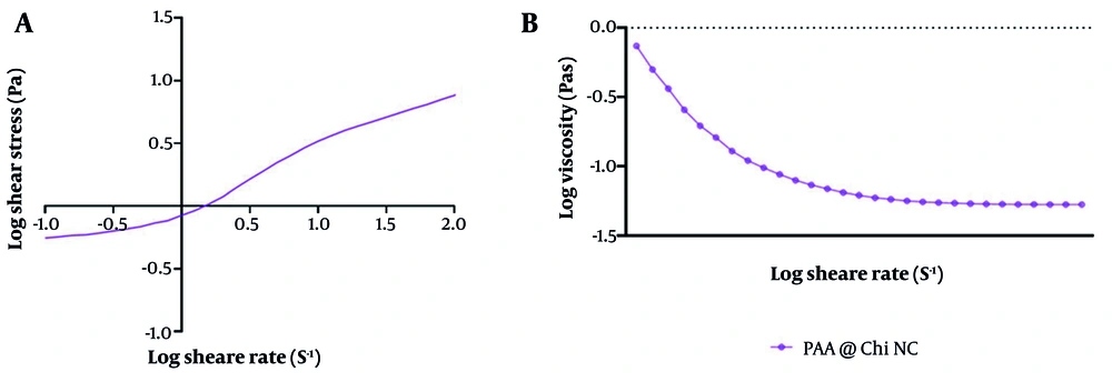 The rheology of PAA-Chi nanofiber formation has been systematically tested to understand its flow properties. The variations in shear stress (Pa) and apparent viscosity (Pas) with shear rate (s-1), as presented in Figure 4, are as follows. As demonstrated in Figure 4A, shear stress gradually and nearly linearly increases throughout the total tested shear rate range, indicating that it has a stable rheological response without sudden fluctuation when the input is perturbed. The uniform increment in shear stress with respect to the applied force implies an internal structure that appears homogeneous and exhibits strong intermolecular interactions between both PAA and Chi chains, responsible for such consistent deformation.