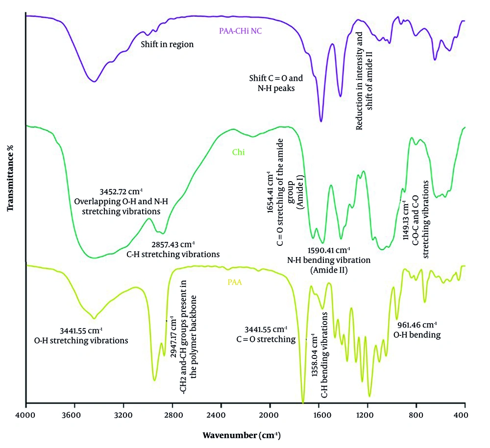 Comparative FTIR analyses of polymeric systems confirm strong intermolecular interactions in PAA-Chi-based materials. In polycaprolactone-chitosan (PCL-CH) nanofibers, peak modifications were attributed to interpolymer bonding and molecular compatibility (25). Similarly, PAA-Chi hydrogels exhibited broad absorption bands (3000 - 3600 cm-1, O-H/N-H stretching) and characteristic peaks at 1637 cm-1 (C=O stretching) and 2921 - 2854 cm-1 (C-H stretching), indicating hydrogen bonding and network formation (30). In PAA-Chi nanoparticles, a decrease in amide I (1662 cm-1) and amide II (1586 cm-1) intensities, along with new peaks at 1731 cm-1 (C=O of PAA) and 1628 cm-1 (NH3+ of Chi), further confirmed polyelectrolyte complex formation through electrostatic interactions (31). Collectively, these results demonstrate that combining PAA with Chi produces stable polymeric networks with enhanced structural stability and functional performance, validating the synthesis of the PAA-Chi NC in this study.