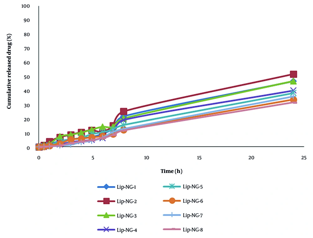 Drug release from liposomal formulations was evaluated within 24 hours. In this study, the highest rate of release after 4 and 24 hours was related to LIP-NG-2 (Table 3). Regression analysis showed that the amount of naringenin released after 4 hours has a significant correlation with the amount of lecithin (P < 0.05). In all formulations studied, the kinetics of naringenin release follow the first-order model (Figure 2).