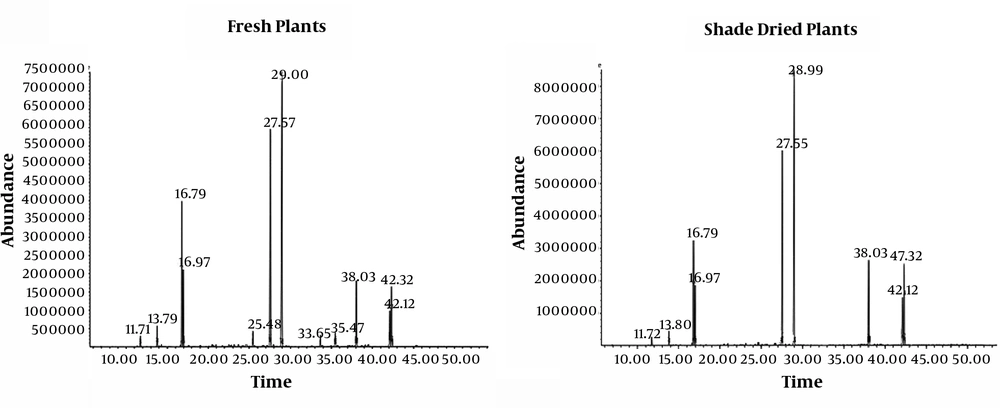 The GC-MS analysis was conducted using an Agilent instrument coupled with a 5973 Mass system equipped with a flame ionization detector (FID) and a BPX5 capillary column (30 m × 0.25 mm; 0.25-μm film thicknesses). The following temperature program was used for the oven: increasing temperature at 60°C, holding for 2 minutes, gradual increasing to 150°C at the rate of 3°C min-1, increasing temperature to 270°C at 5°C min-1, and holding for 15 minutes. The carrier gas was He with a flow rate of 1.1 mL min-1; injector and detector temperatures were 300°C and the split ratio was 1:50. Mass spectra were reserved at 70 eV. The essential oil constituents were identified by comparing the mass spectra and their retention indices with those published in the literature (17) and presented in the MS computer library (17).