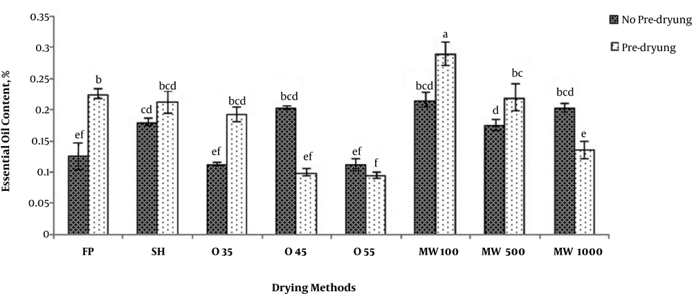 The comparison of mean changes in the essential oil content by different drying methods in both pre-drying conditions. FP: fresh plant; SH: shade drying; O 35, 45, and 55: oven-drying at 35, 45, and 55°C, respectively; MW 100, 500, and 1000: microwave drying at 100, 500, and 1000 W, respectively.