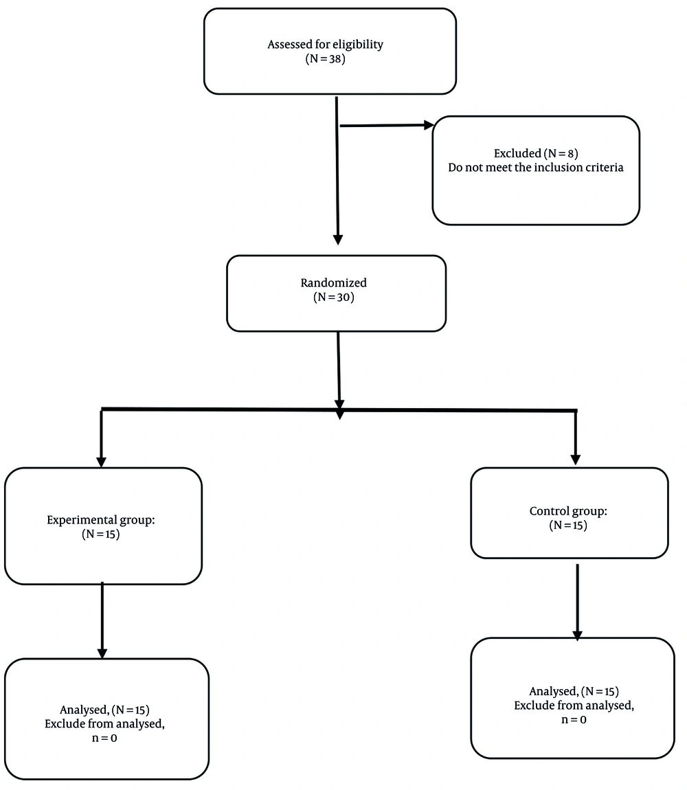 This study received ethical approval from the Ethics Committee of the Sport Sciences Research Institute (IR.SSRC.REC.1402.254). A quasi-experimental design was employed to evaluate the effects of the intervention, utilizing non-random convenience sampling to recruit women aged 30 to 50 years residing in Bojnord, Iran. The required sample size was calculated a priori using G*Power 3.1 software, based on an assumed effect size (Cohen’s d = 0.8), α = 0.05, and power (1 - β) = 0.80. This effect size was derived from previous studies on DNS and core stabilization interventions in individuals with chronic low back pain (1). To account for potential attrition, a total of 30 participants were enrolled in the study. After meeting the inclusion criteria, 30 participants were assigned to either the experimental group (n = 15) or the control group (n = 15). The assignment was performed using a computer-generated random number table, with each participant receiving a unique identification number. Random allocation occurred without stratification, ensuring that all participants had an equal chance of being assigned to either group. This method was considered suitable since baseline variables — pain intensity, lumbar lordosis angle, and APT — were similar across participants. Figure 1 (CONSORT flow diagram) shows the participant flow throughout the study phases.