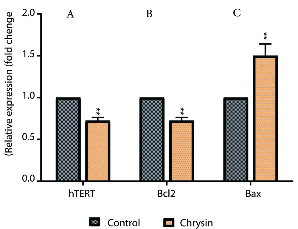 To study the expression of apoptosis-related genes in cancer cells, 24 hours after incubation with different concentrations of Chr, the culture medium was completely removed, and the cells were rinsed with PBS. The cells were then detached, and RNA was extracted using the RNX-Plus kit according to the manufacturer’s instructions. The concentration and purity of the extracted RNA were determined using a spectrophotometer (Thermo Scientific™ NanoDrop™) and confirmed by agarose gel electrophoresis. Total RNA was reverse-transcribed into cDNA using the Prime Script RT reagent kit, following the manufacturer’s protocol. Real-time PCR was conducted with SYBR Green PCR Master Mix (Ampliqon, Denmark) to analyze the expression levels of Bax, Bcl2, and human telomerase reverse transcriptase (hTERT). The expression of these target genes was compared to the housekeeping gene GAPDH using the comparative threshold cycle (Ct) method.