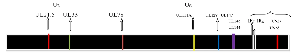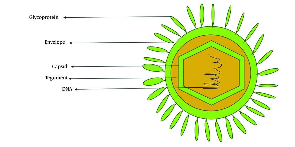 Cytomegalovirus (CMV), or human herpesvirus 5 (HHV-5), derives its common name from the characteristic cytopathic effect it induces in infected cells, cyto (cell) megalo (enlargement), resulting in enlarged (cytomegalic) cells with intranuclear inclusions (4). It is a member of the Herpesviridae family and is classified within the Betaherpesvirinae subfamily and genus Cytomegalovirus (5). The virion is characterized by a spherical morphology, a double-stranded linear DNA genome encased within an icosahedral capsid. This core structure is enveloped by a tegument layer and a lipid bilayer membrane as shown in Figure 1. Figure 2 shows the genome of CMV, approximately 230 kilobases in size, characterized by unique long (UL) and short (US) regions (6). The hCMV genome has UL and US regions with inverted repeats. These regions contain most viral protein-coding genes. The UL region encodes proteins for replication (DNA polymerase UL54) and structure (major capsid protein UL86). The US region is key for pathogenesis, containing immune evasion genes [US2-US11, downregulating major histocompatibility complex (MHC) I and II] (7). Inversion of these regions creates four isomers, potentially increasing genetic flexibility and tropism. Cytomegalovirus encodes over 200 viral proteins from more than 751 open reading frames and exhibits a temporal gene expression cascade classified into immediate early (IE), early (E), and late genes (8). The major capsid protein, triplex dimer and monomer, and the smallest capsid protein form the core capsid proteins, with additional structural components in the tegument and envelope facilitating virion assembly and packaging (9).