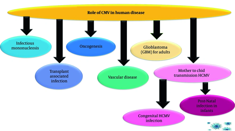 Human cytomegalovirus (hCMV), a highly widespread herpesvirus, causes lifelong latent infections with periodic reactivation. Affecting 60 - 90% globally, hCMV is often asymptomatic in healthy individuals but poses risks to the immunocompromised, neonates, and transplant recipients (1). As a leading cause of congenital infections, it can result in birth defects and neurological issues. Its complex genome encodes proteins for immune evasion and replication (2). This narrative review aims to synthesize current knowledge on the molecular pathogenesis and clinical impact of hCMV, providing a unified resource for understanding diagnostics, treatments, and prevention (3).
