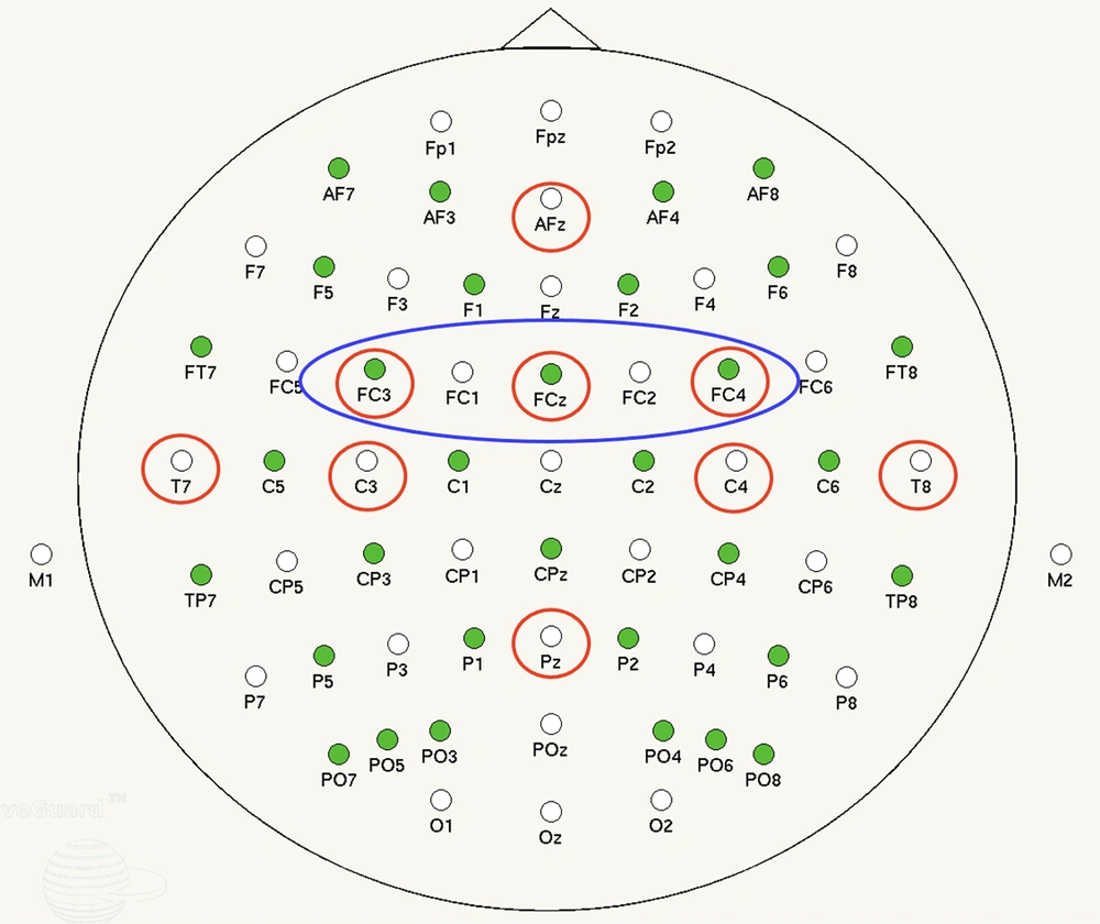 Power analyses focused on cortical areas associated with the frontoparietal network (FPN) and motor learning (18). Based on electrode montages used in previous research (4, 19) electrodes of interest (EOI) were as follows (Figure 2): (1) AFz and Pz (general and task-relevant attentional resources, respectively); (2) T7 (verbal-cognitive processing and memory encoding), T8 (visuospatial processing); (3) left (C3) and right (C4) sensorimotor cortices (motor execution); and (4) left (CP3) and right (CP4) premotor and supplementary (FCz) motor cortices (motor planning).
