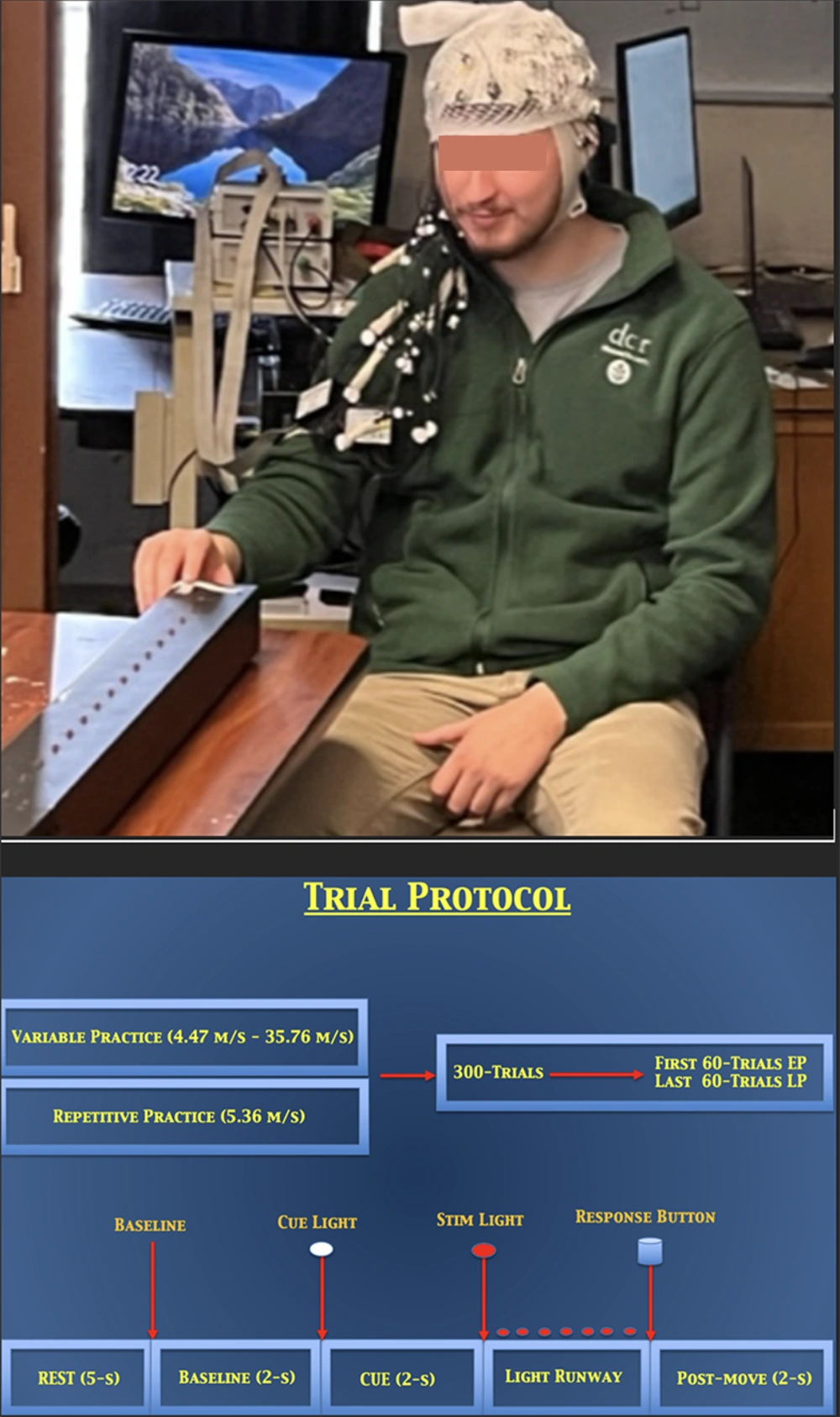 In the first visit participants (1) completed a ‘Participant Demographic and Screening Questionnaire’ to determine potential visual, central nervous system, and/or orthopedic problems that might compromise their performances on the ATT; (2) gave their informed consent; (3) were fitted for the appropriately sized EEG elastic electrode cap; (4) observed the ATT to be performed; and (5) were assigned to one of the practice conditions.