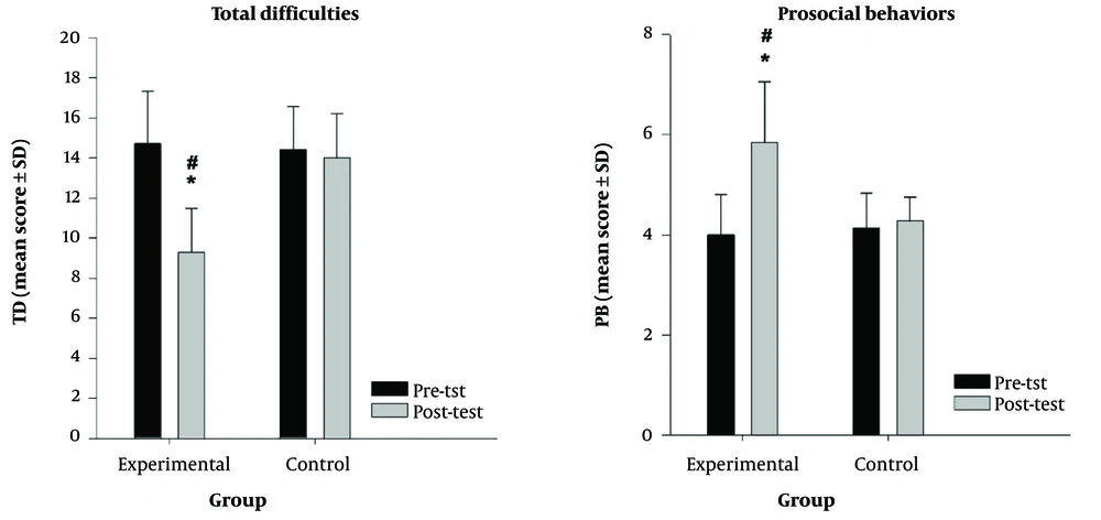 The SDQ, a screening tool for behavioral problems in children and adolescents aged 4 to 16 years, was used to assess participants before and after the intervention. Designed by Robert Goodman in England in 1997, the SDQ has parent, teacher, and self-report versions (the latter for ages 11 - 16). The questionnaire consists of 25 items divided into five scales, each containing five items: Emotional symptoms, conduct problems, hyperactivity/inattention, peer relationship problems, and prosocial behavior. The parent-report version was used in this study. Respondents rated each item as "not true" (scoring 0), "somewhat true" (scoring 1), or "certainly true" (scoring 2). Scale scores are calculated by summing the scores of the five items within each scale, resulting in a range of 0 to 10 for each subscale. The internal consistency (Cronbach’s alpha) for the parent SDQ in this study was α = 0.7 (27, 28).
