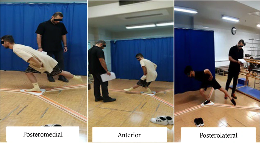 A Y-balance test (YBT) kit is used to assess dynamic balance (Figure 2). After familiarizing the subjects and conducting a trial to familiarize themselves and reduce possible errors, the dynamic balance was evaluated in three anterior, posteromedial, and posterolateral directions in three attempts for each direction. The study was approved by the Research Ethics Committees of Faculty of Physical Education and Sports Sciences, University of Tehran (IR.UT.SPORT.REC.1402.019). For statistical analysis, after normalizing the data according to the length of each subject’s lower limb, the highest reach distance in each direction was recorded for analysis (5, 18, 25-27). After assessing the normality of data distribution using the Shapiro-Wilk test, an independent t-test was conducted to analyze differences between the variables of interest in the two groups. SPSS version 27 was used for statistical analysis, with a significance level set at α ≥ 0.05.