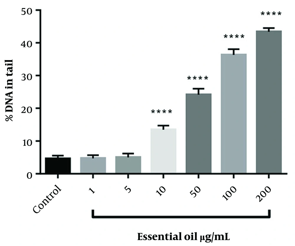 ![Percentage of DNA in comet tails of human umbilical vein endothelial cells (HUVECs) treated with varying concentrations of <i>Dracocephalum lindbergii</i> essential oil, indicating genotoxicity [The notation (****) indicates a statistically significant difference compared to the control group (P < 0.0001)]. Percentage of DNA in comet tails of human umbilical vein endothelial cells (HUVECs) treated with varying concentrations of <i>Dracocephalum lindbergii</i> essential oil, indicating genotoxicity [The notation (****) indicates a statistically significant difference compared to the control group (P < 0.0001)].](https://services.brieflands.com/cdn/serve/31710/72dba133cfbda737d480102bd0a1f2c6e47ddae5/jrps-13-1-165509-i004-preview.webp)