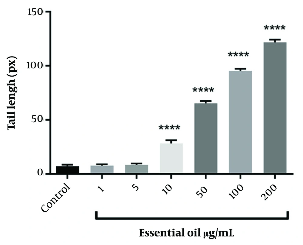![Comparison of tail moment values in human umbilical vein endothelial cells (HUVECs) exposed to different concentrations of <i>Dracocephalum lindbergii</i> essential oil, reflecting the extent of DNA damage [The notation (****) denotes a statistically significant difference compared to the control group (P < 0.0001)]. Comparison of tail moment values in human umbilical vein endothelial cells (HUVECs) exposed to different concentrations of <i>Dracocephalum lindbergii</i> essential oil, reflecting the extent of DNA damage [The notation (****) denotes a statistically significant difference compared to the control group (P < 0.0001)].](https://services.brieflands.com/cdn/serve/31710/0b63857e9713b60ad86383668aa17f1b6f43b551/jrps-13-1-165509-i005-preview.webp)