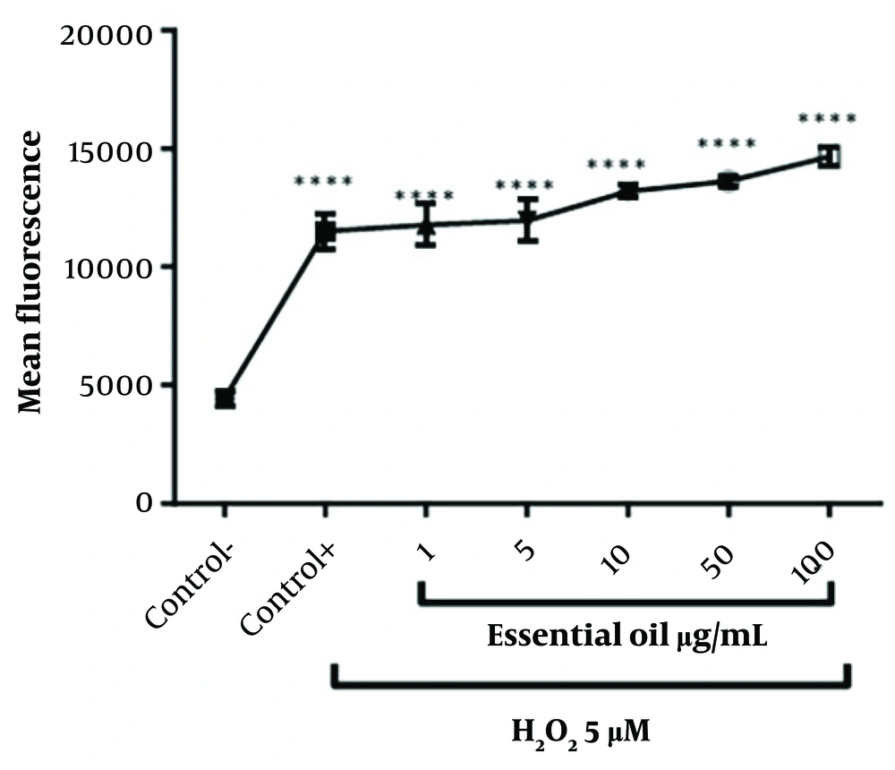 ![Intracellular reactive oxygen species (ROS) levels in human umbilical vein endothelial cells (HUVECs) co-treated with <i>Dracocephalum lindbergii</i> essential oil and hydrogen peroxide (H<sub>2</sub>O<sub>2</sub>, 5 µM), indicating oxidative stress induction [The notation (****) indicates a statistically significant difference compared to the control group (P < 0.0001)] Intracellular reactive oxygen species (ROS) levels in human umbilical vein endothelial cells (HUVECs) co-treated with <i>Dracocephalum lindbergii</i> essential oil and hydrogen peroxide (H<sub>2</sub>O<sub>2</sub>, 5 µM), indicating oxidative stress induction [The notation (****) indicates a statistically significant difference compared to the control group (P < 0.0001)]](https://services.brieflands.com/cdn/serve/31710/c62fd58429cea71f5cbb7934071155d815e03e7c/jrps-13-1-165509-i008-preview.webp)