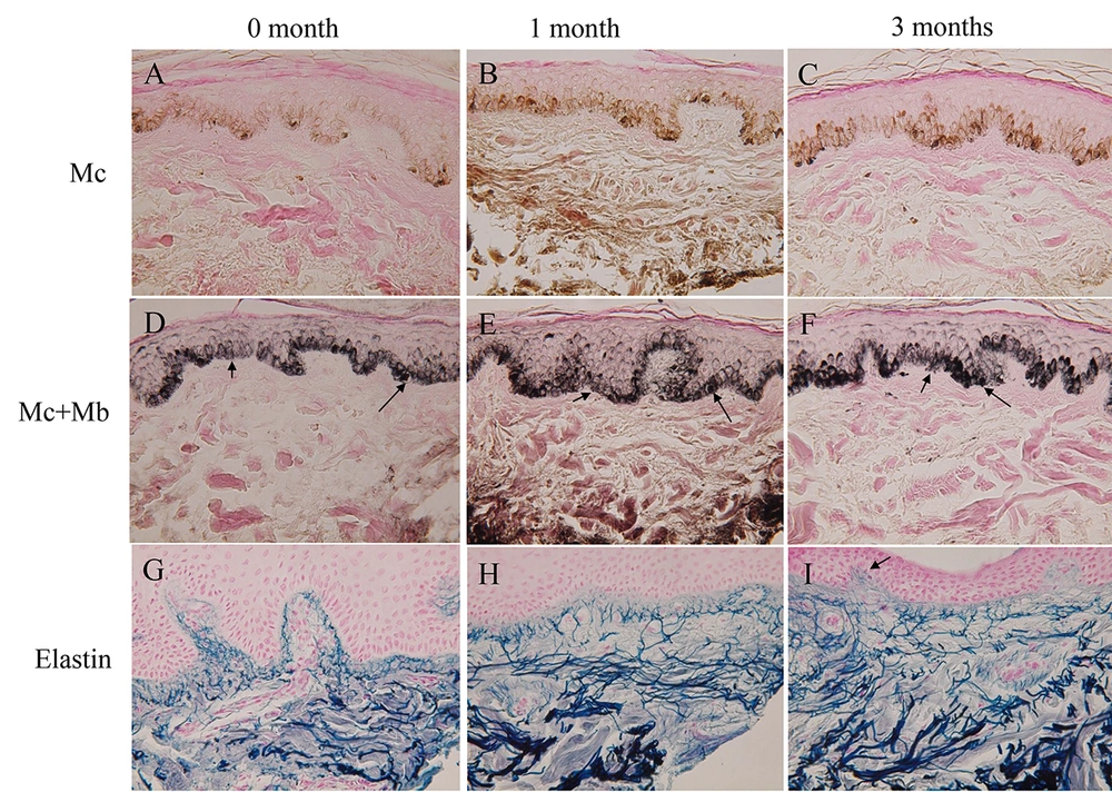 The average of melanocyte populations/0.1 mm2 from 3 volunteers treated with elastin + FFC (Table 1, group B) linearly increased after the treatment, but not in FFC alone (Table 1, group A). The difference in the melanocyte and melanoblast populations of FFC alone before and after 3 months was not statistically significant (both melanocyte and melanoblast: P > 0.5). Although the difference in the melanocyte populations of the treatment (elastin + FFC) before and after 1 month was not statistically significant (0.1 < P < 0.2), the difference after 3 months was statistically significant (P < 0.001). However, the averages of melanoblast populations/0.1 mm2 failed to increase both 1 and 3 months after the treatment (1 month: 0.3 < P < 0.4; 3 months: P > 0.5).