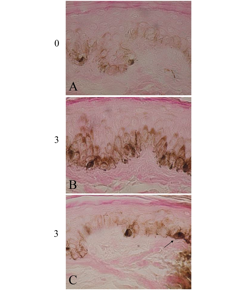 The skin color was gradually darkened in the 3 volunteers (Table 1, group B) treated with both elastin peptides and FFC, but not with FFC alone (Table 1, group A). Figure 1A shows the scalp skin of volunteer No. 5. Many dopa-positive melanocytes with dendrites were observed in the epidermis of the rete ridge and inter-rete ridge. Figure 1D shows the dopa-premelanin-positive cells. Melanocytes were darkly stained by this reaction, while melanoblasts were lightly stained. One month after the treatment, dopa-positive cells (Figure 1B) and dopa-premelanin-positive cells (Figure 1E) increased. Three months after the treatment, these cells further increased (Figure 1C and F). However, the increases in these cells were not observed in the skin treated with FFC alone (Table 1, group A). Higher magnification of the skin 3 months after the treatment revealed increased dopa-melanin depositions, dendritogenesis, and melanosome maturation in melanocytes, as well as increased epidermal melanin pigmentations (Figure 2B) compared to the control (the skin before the treatment; Figure 2A). In some cases, mitotic divisions of melanocytes were observed (Figure 2C, arrow). However, no mitotic divisions of melanoblasts were observed. In the other 2 volunteers (No. 4 and 6), similar tendencies were observed.