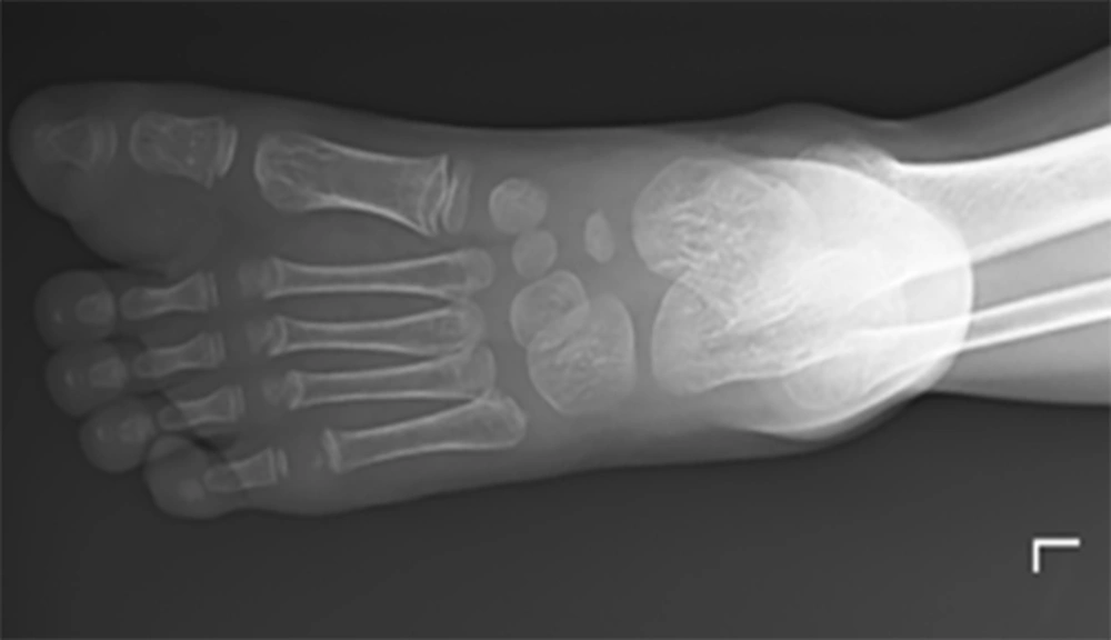 Lipomas are benign neoplasms composed of mature adipose tissue. These tumors can be found in various parts of the body. They are slowly growing tumors and are usually asymptomatic (4). Commonly affected areas include the neck, trunk, shoulders, and arms, while occurrences in the hands or feet are rare. Foot lipomas, in particular, are uncommon, with only a few cases reported at different sites within the foot (6, 7). Both benign and malignant soft tissue lesions may affect the foot. These include ganglions, lipomas, villonodular synovitis, foreign body reactions, fibrolipomas, and soft tissue sarcomas (8). Myxolipoma is a rare benign tumor characterized by the presence of a mucoid substance and distinct histopathological features, accounting for less than 1% of all lipomas (4, 9). It consists of a lipoma interspersed with abundant mucoid material. Some cells within the developing lipoma will undergo differentiation into adipocytes while others, in addition to forming fatty tissue, secrete mucoid material, which leads to the formation of a myxoid appearance (10). The myxoid change is due to a gelatinous matrix which is composed of water mixed with sulfated and nonsulfated glycosaminoglycans (5). Most cases of myxolipoma are reported in individuals in their fifth or sixth decade of life (4). A few cases have been documented in various parts of the body, including the oral cavity, cervico-mediastinal region, retroperitoneum, heart, tongue, epiglottis, and kidney, occurring in both adults and children over the age of five (9). To the best of our knowledge, this is the first case of myxolipoma of a foot in a 5-year-old child. Ultrasonography is the preferred imaging modality for superficial soft tissue masses. The MRI has 94% accuracy with the added advantage of delineating the anatomical extension of the lesion and displaying the lesion in relation to the surrounding (9, 11). Surgical excision is usually curative with minimal risk of recurrence.