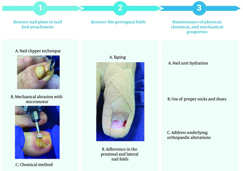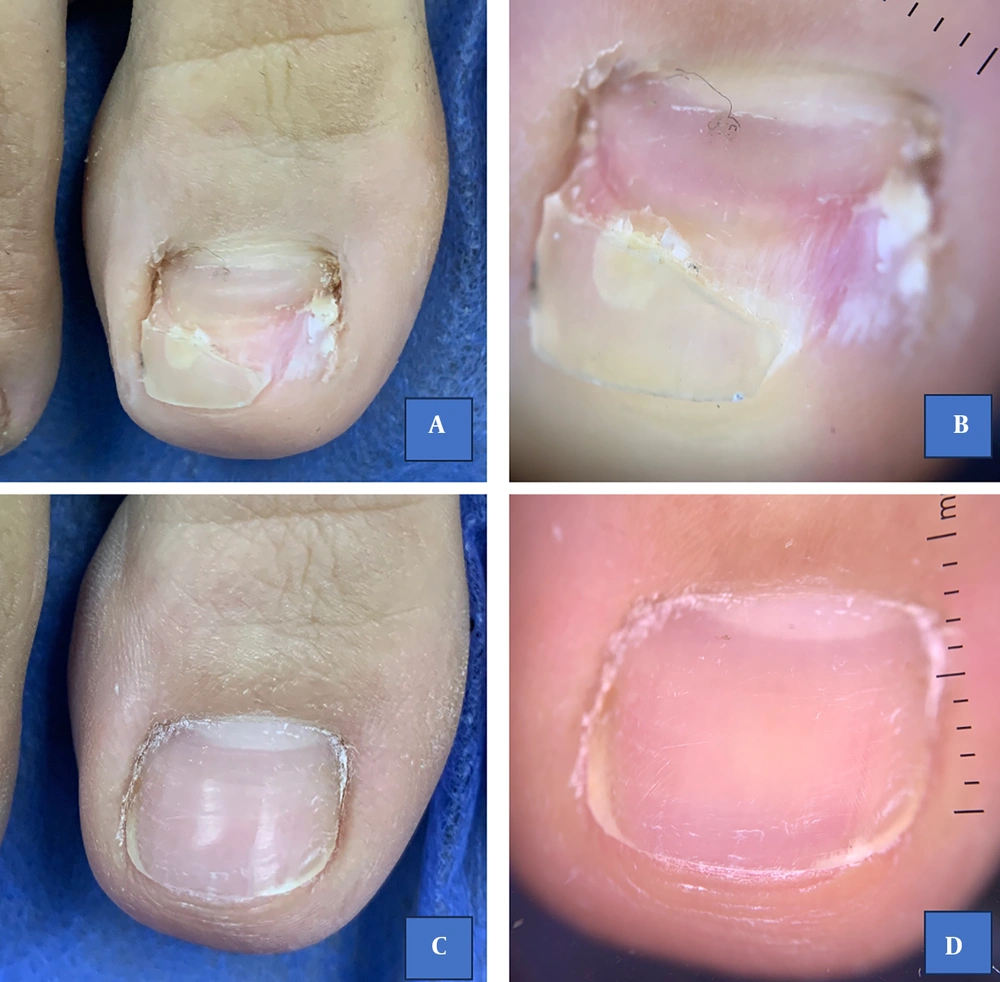Onychomycosis is a frequent cause of chronic onycholysis that can lead to nail dystrophy; unfortunately, the cure rates are low, and the recurrence rate is high (11). Currently, there are few articles that describe the non-surgical management of nail dystrophies (12, 13).