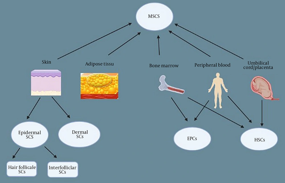 A proper healing procedure for a chronic wound is inhibited at one of its steps or after the injury. In the inflammatory phase of the wound, there are large numbers of early-stage macrophages, neutrophils, fibrin clots, and platelet plugs in the wound bed. The wound healing procedure begins at this stage (16). Without any therapy, inflammatory-related cells (macrophages and neutrophils) remain in the wound bed, and the uptake of endogenous stem cells is impaired, which in turn causes an imbalance in the harmony of the procedure. Granular tissue formation is inhibited due to the absence of myofibroblast differentiation, angiogenesis, re-epithelialization, and collagen deposition (17). Treating these wounds requires special medical skills and can be long-term and challenging (18). New methods of chronic wound therapy include various dressings (occlusive, hydrogel, gauze, etc.), skin grafts, growth factors, and hyperbaric oxygen (19, 20). Although these methods are easy to use and well-studied, they have many limitations and disadvantages that have not significantly impacted the situation and are only moderately effective. Therefore, the necessity for more effective treatments for healing wounds is felt (21). Many other types of therapies, including cell factors, tissue engineering, stem cells, and so on, have been tested by researchers (5, 22). The newest findings show the enormous potential of stem cell therapy in regenerative medicine, such as in the healing of chronic wounds. Stem cells have been shown to increase wound healing through several direct or indirect procedures, such as stimulation of resident cells, releasing growth factors, inflammation, and angiogenesis (23). Using stem cells to treat chronic wounds has many benefits not found in traditional methods. Local or systemic exogenous stem cells mobilize the patient's resident stem cells to participate in the wound healing and granulation tissue (GT) formation process by facilitating angiogenesis (24). Experiments have proven that the administration of stem cells positively affects the biochemistry of the healing process, which speeds up the wound closure period. They not only can proliferate and differentiate but also can increase migration, angiogenesis, and immunomodulation of cells in vivo (25, 26). The main types of stem cells that play a role in wound healing are mesenchymal stem cells (MSCs), EPCs, epidermal stem cells, dermal stem cells, and hematopoietic progenitor/stem cells (HP/SCs) (5). Apart from stem cells found in the skin (epidermal and dermal), the other three stem cells (MSCs, EPCs, HP/SCs) are the aqueous portion of the enzymatic digestion of lipoaspirate, which is itself used to treat healing wounds (27, 28) (Figure 1). Hematopoietic and MSCs are the most widely used cells in therapy (29).