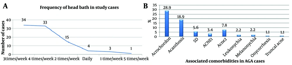 Of 68 male cases, 3 (4.411%) were AGA grade I, 30 (44.11%) were grade II, 14 (20.588%) were grade III, 9 (13.23%) were grade III vertex, 8 (11.76%) were grade IV, and 2 cases (2.941%) each were grade V and grade VII. No cases of grade VI were observed. Out of the 22 females, 11 (50%) each belonged to Ludwig’s grade I and II, and no cases were observed in grade III. The frequency of head bath among study cases and the comorbidities associated with AGA cases are depicted in Figure 2A and B, respectively.