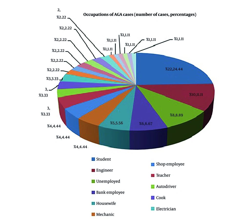 In our study, the majority of cases belonged to the student group (24.4%; 22 cases) followed by engineers (11.1%), the unemployed (8.9%), and bank employees (6.7%). However, Devi et al. (13) observed the highest incidence among the working population (55.5%) followed by students (44.4%). The higher proportion of student cases in our study may be due to day-to-day stress, altered dietary habits, and lifestyle factors. We observed a significant family history in 32 cases (35.6%), similar to the majority of studies (5, 11, 12), which highlights the influence of genetic factors among AGA cases.
