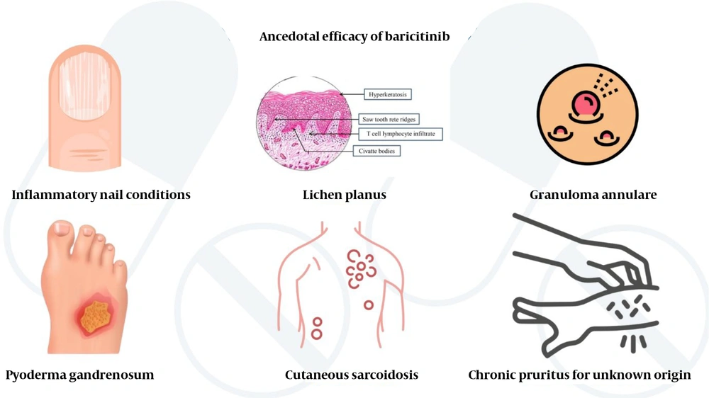 Vitiligo is an acquired, multifactorial, chronic depigmenting disorder of the skin caused by melanocyte loss. The main pathogenic factor implicated is IFN-γ-related chemokines via the JAK-STAT pathway, especially CXCR3+ and CXCL-10. CXCR3+CD8+ T-cells on activation stimulate melanocyte destruction and apoptosis. Therefore, JAK inhibitors block the action of IFN-γ and CXCL-10 and represent a potential therapy for vitiligo (32). In vitro, baricitinib (25 μM) enhanced tyrosinase activity, stimulated melanin synthesis, and upregulated TYR and TRP 1 expression in ultraviolet B-damaged melanocytes, suggesting a role in restoring melanocyte function and mitigating pigment loss under oxidative stress (33). Across two complementary studies, combining oral baricitinib with narrow band-ultraviolet B therapy (NB-UVB) yielded clinically meaningful repigmentation and acceptable safety in progressive, nonsegmental vitiligo. In an open-label study, patients were assigned combination therapy with baricitinib 2 mg daily and NB-UVB three times a week or NB-UVB alone three times a week. Of the 33 patients, 70.6% in the combination group and 12.5% in the control group achieved a total Vitiligo Area Scoring Index (T-VASI50) response at week 16 (relative risk = 5.6; 95% confidence interval = 1.5 - 21.4; P = 0.001) (34).