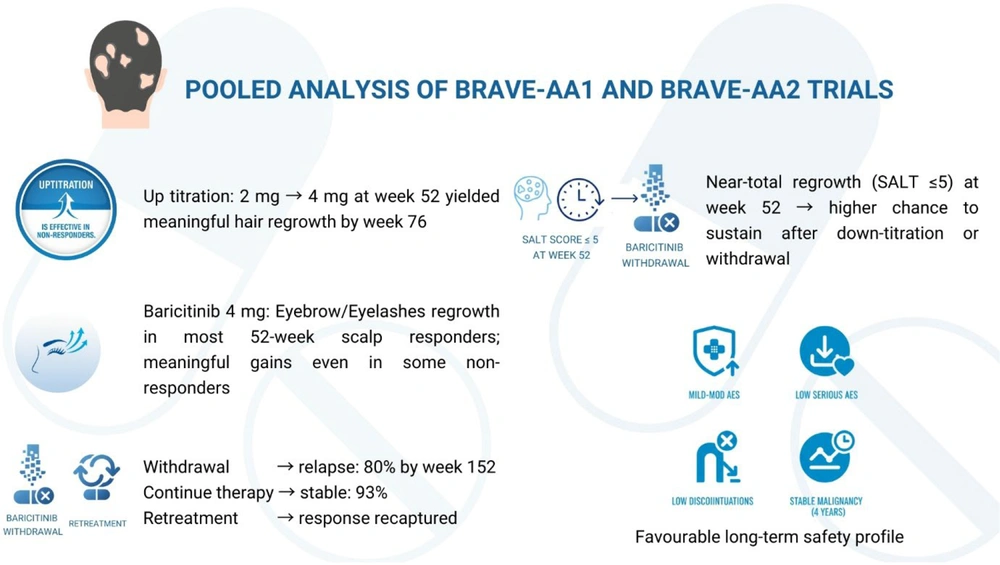 - Up-titration is effective in non-responders: Increasing the baricitinib dose from 2 mg to 4 mg in non-responders at week 52 led to meaningful benefits by week 76, with notable eyebrow and eyelash regrowth (9).