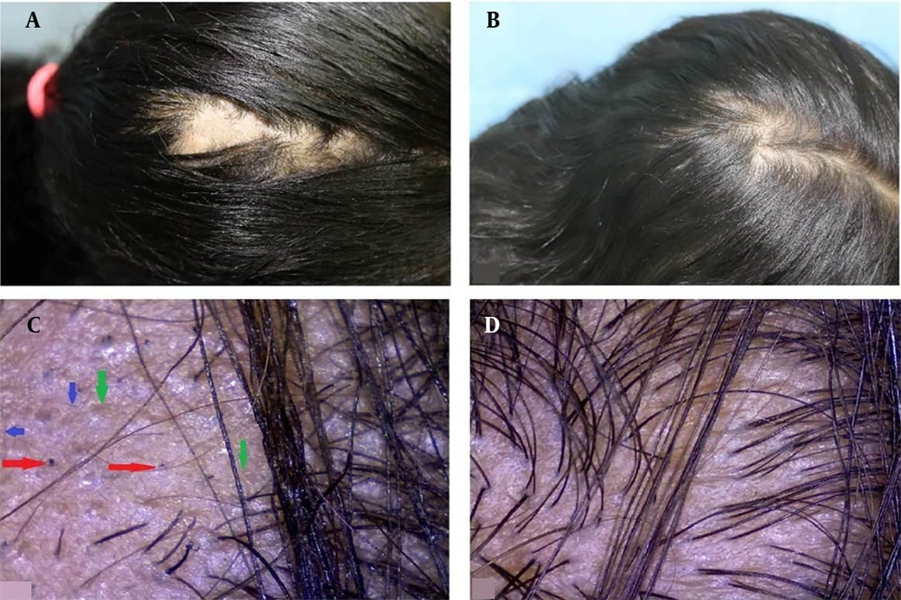 ![Female patient 9 years old with scalp alopecia areata (AA). A, before treatment [Severity of Alopecia Tool Score (SALT) = 6.3]; B, after 3 months of treatment of topical calcipotriol (SALT = 0.6) (group I); C, dermoscopic picture before treatment (100X): Red arrow, black dots; green arrow, yellow dots; and blue arrows, short vellus hairs; D, dermoscopic picture after treatment (100X). Female patient 9 years old with scalp alopecia areata (AA). A, before treatment [Severity of Alopecia Tool Score (SALT) = 6.3]; B, after 3 months of treatment of topical calcipotriol (SALT = 0.6) (group I); C, dermoscopic picture before treatment (100X): Red arrow, black dots; green arrow, yellow dots; and blue arrows, short vellus hairs; D, dermoscopic picture after treatment (100X).](https://services.brieflands.com/cdn/serve/3170f/396f2a7c719c6d88ce58035a5d84700bb0ae68f9/jssc-12-3-167118-g001-preview.webp)