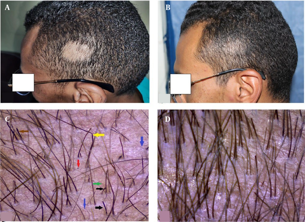 ![A 22-year-old male patient with scalp alopecia areata (AA). A, before treatment [Severity of Alopecia Tool Score (SALT) = 6.5]; B, after 3 months of treatment with platelet-rich plasma (PRP) (SALT = 0.7) (group II); C, dermoscopic picture (100X) before treatment: Red arrow, black dot; green arrow, yellow dot; blue arrow, short vellus; black arrow, micro exclamation mark hair; brown arrow, Pohl-Pinkus sign; and yellow arrow, coudability hair; D, dermoscopic picture after treatment (100X). A 22-year-old male patient with scalp alopecia areata (AA). A, before treatment [Severity of Alopecia Tool Score (SALT) = 6.5]; B, after 3 months of treatment with platelet-rich plasma (PRP) (SALT = 0.7) (group II); C, dermoscopic picture (100X) before treatment: Red arrow, black dot; green arrow, yellow dot; blue arrow, short vellus; black arrow, micro exclamation mark hair; brown arrow, Pohl-Pinkus sign; and yellow arrow, coudability hair; D, dermoscopic picture after treatment (100X).](https://services.brieflands.com/cdn/serve/3170f/50098448fbcbc15442519879e36170c612ad20e6/jssc-12-3-167118-g002-preview.webp)