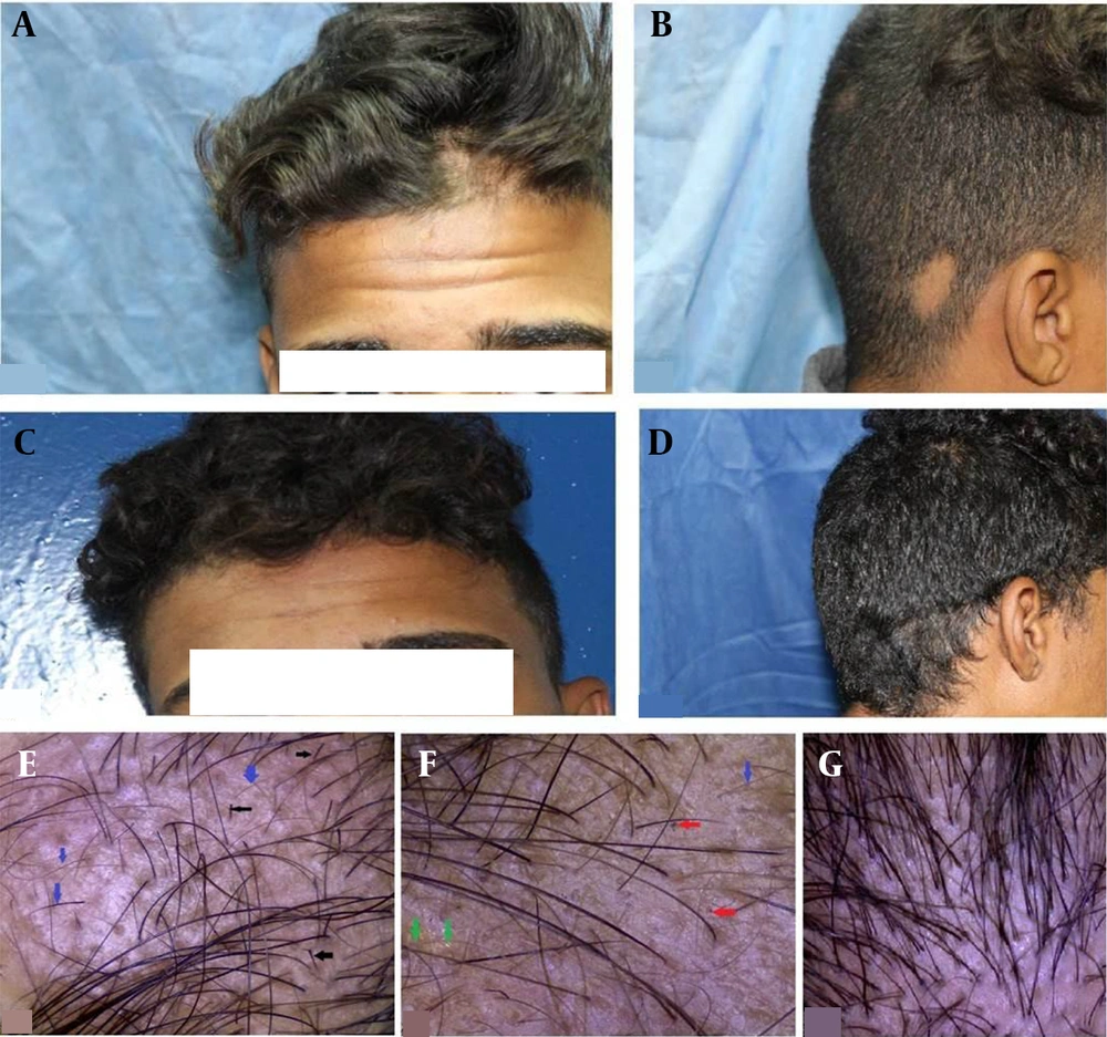 ![A 17-year-old male patient with scalp alopecia areata (AA). A and B, before treatment [Severity of Alopecia Tool Score (SALT) = 6.1]; C and D, after 3 months of treatment with a combination of topical calcipotriol and platelet-rich plasma (PRP) (SALT = 0) (group III); E and F, dermoscopic picture before treatment (100X): Red arrows, black dots; green arrows, yellow dots; blue arrow, short vellus hairs; black arrows, micro exclamation mark hairs; G, dermoscopic picture after treatment (100X). A 17-year-old male patient with scalp alopecia areata (AA). A and B, before treatment [Severity of Alopecia Tool Score (SALT) = 6.1]; C and D, after 3 months of treatment with a combination of topical calcipotriol and platelet-rich plasma (PRP) (SALT = 0) (group III); E and F, dermoscopic picture before treatment (100X): Red arrows, black dots; green arrows, yellow dots; blue arrow, short vellus hairs; black arrows, micro exclamation mark hairs; G, dermoscopic picture after treatment (100X).](https://services.brieflands.com/cdn/serve/3170f/58cee737b0e43eb6b343ec63b837ee4f69e144f1/jssc-12-3-167118-g003-preview.webp)