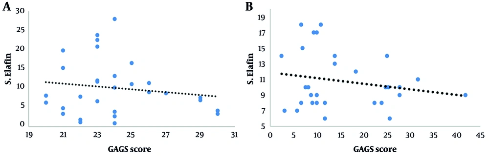 There was a significant negative mild correlation between GAGS score and serum elafin level before treatment (P = 0.042, r = -0.262), and there was a significant negative mild correlation between GAGS score and serum elafin level after treatment (P = 0.048, r = -0.190; Figure 1A and B).