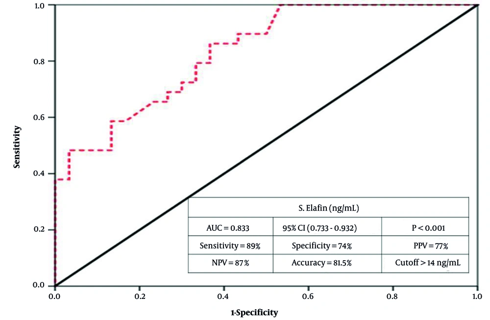 In this study, serum elafin showed excellent validity (P < 0.001) at a cut-off value of 14 ng/mL; sensitivity was 89%, specificity was 74%, PPV was 77%, NPV was 87%, and accuracy was 81.5%. This is similar to El-Refaei et al. (15) who found that serum elafin had excellent validity (AUC = 0.928, P < 0.001), at a cut-off value of 0.43, sensitivity was 92.5%, specificity was 82.5%, PPV was 84.1%, NPV was 91.7%, and accuracy was 87.5%.