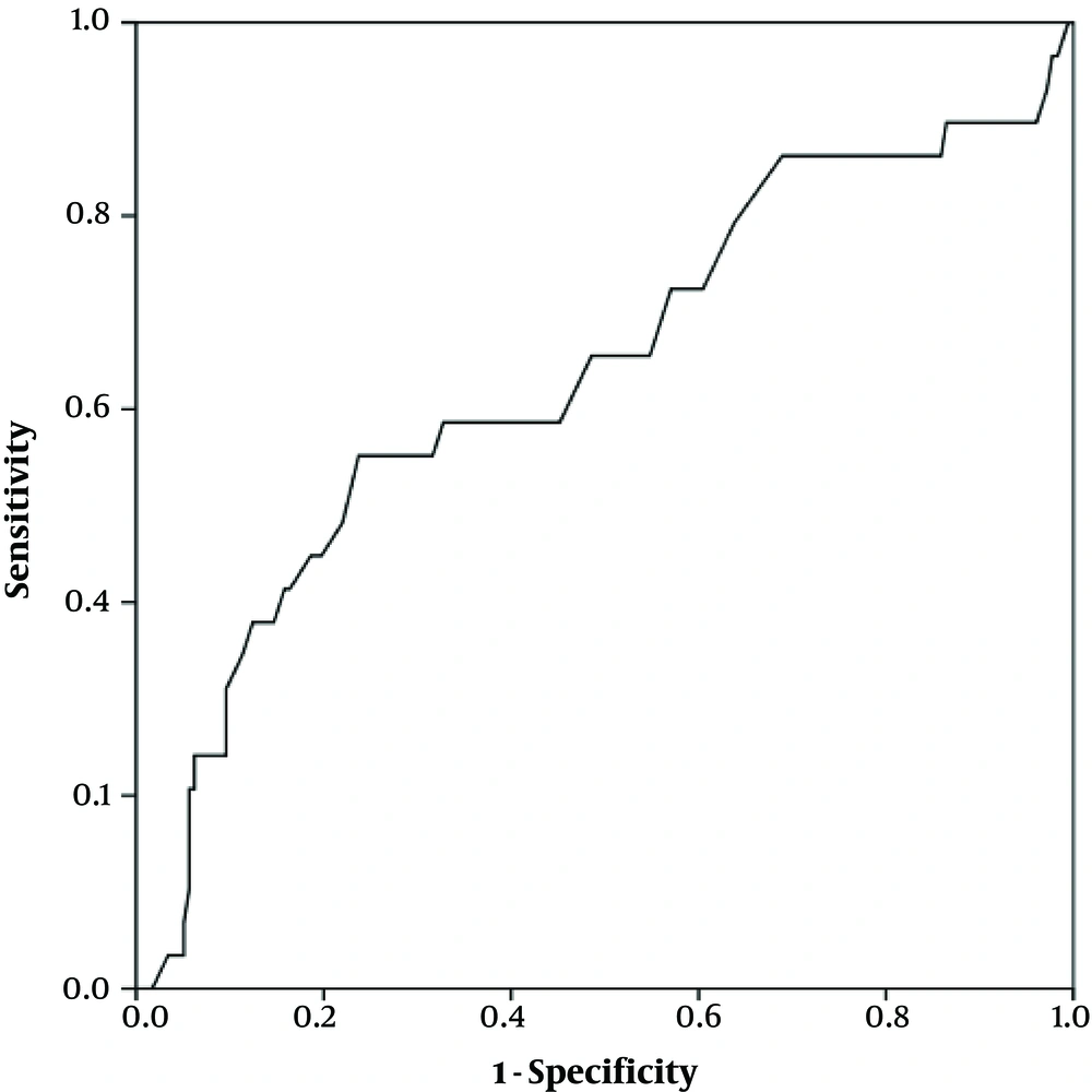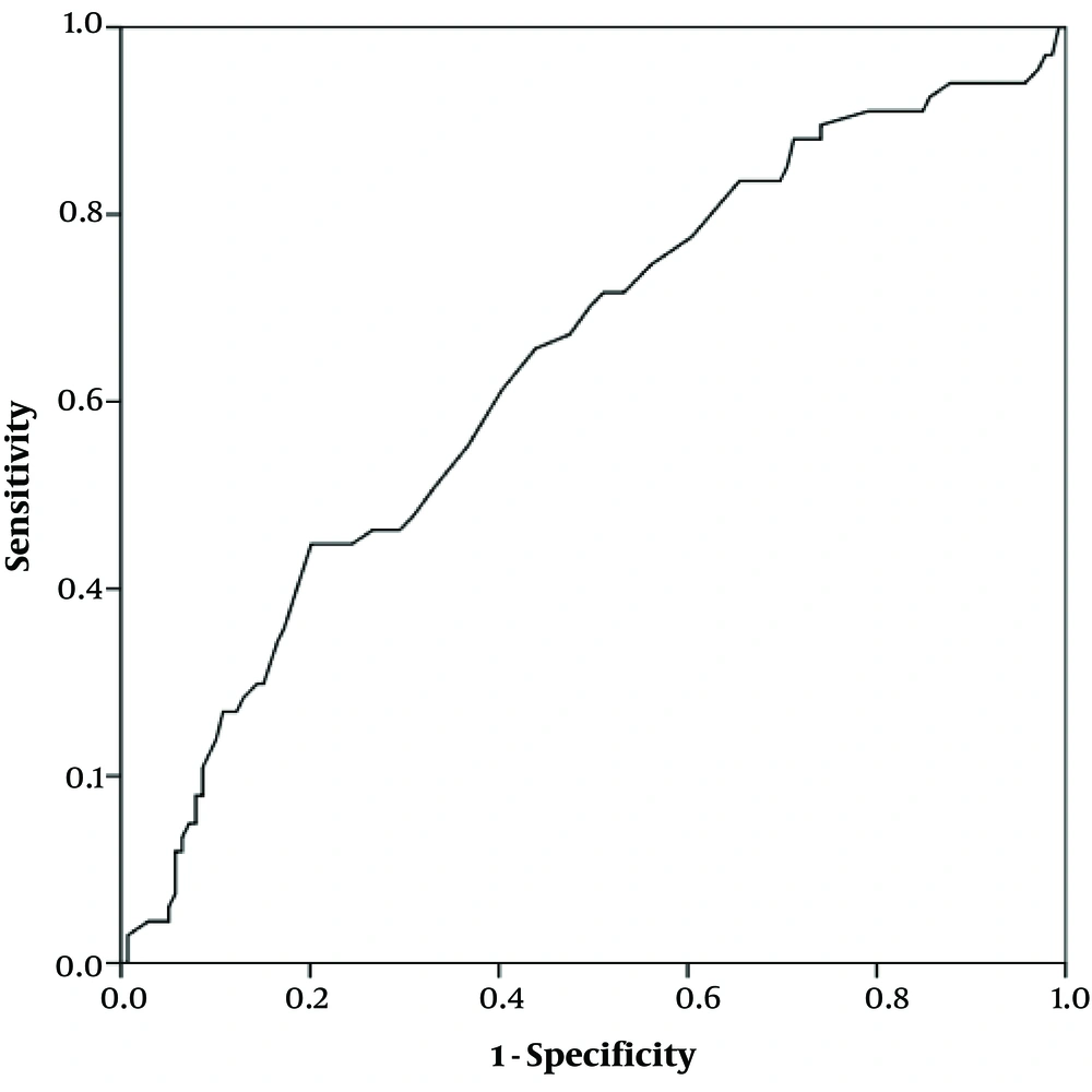 Receiver operating characteristics (ROC) curve also demonstrated acceptable effect of uric acid in predicting extensive CAD with or without involvement of LM disease (P value = 0.018 and area under the curve was 0.638). Best threshold for uric acid level to predict 3VD was serum level of 5.45 which execute sensitivity and specificity of 70% and 50% respectively. Besides, serum uric acid level of 5.65 was the best threshold to foreseen the SYNTAX score of more than 32 with a sensitivity of 65% and specificity of 51% (Figures 1 and 2).