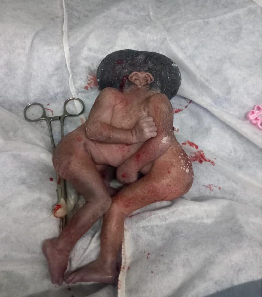 A 29-year-old woman was admitted at Al-Zahra hospital, a referral and academic center affiliated with Guilan University of Medical Sciences (GUMS), due to severe lower abdominal pain and mild bleeding. She had not received any prenatal care or assessment during pregnancy until she was admitted to our hospital at 28 weeks. She did not have any noticeable medical history and did not receive any medication or supplementation. She was gravida 4 and her three healthy children were born via normal vaginal delivery. During the initial evaluations, it was determined that she had not received any prenatal care and screening before 28 weeks of pregnancy. The results of abdominal examinations and Leopold maneuver showed that the fundal height (the distance from pubic bone to the top of the uterus) was about 30 centimeters and the fetal heart rate was 140 beats per minute. Abdominal ultrasound showed the two fetuses were conjoined at the head, face, and chest. The amniotic fluid was maximally normal. The placenta was anterior, and no evidence of placenta accreta was seen. After the diagnosis of a non-separable case of CTs, it was planned to terminate the pregnancy and due to the gestational age of 28 weeks, a CS was considered. Spinal anesthesia was performed at the level of the third and fourth lumbar vertebrae (L3-L4) in the sitting position with 10 mg of Marcaine and under standard monitoring. Cephalothoracopagus type of CTs that were fused from the face to the thoracic part until the lower abdomen with one umbilicus, and two pairs of upper and lower limbs. Weighing 1120 g and 38 cm in length, was delivered and after a while they died and no resuscitation was performed. This type of CTs was rare, as the twins were completely fused from face and thorax (Figure 1). After explaining the importance of the issue and the valuable implications of publishing this case, informed consent was obtained.