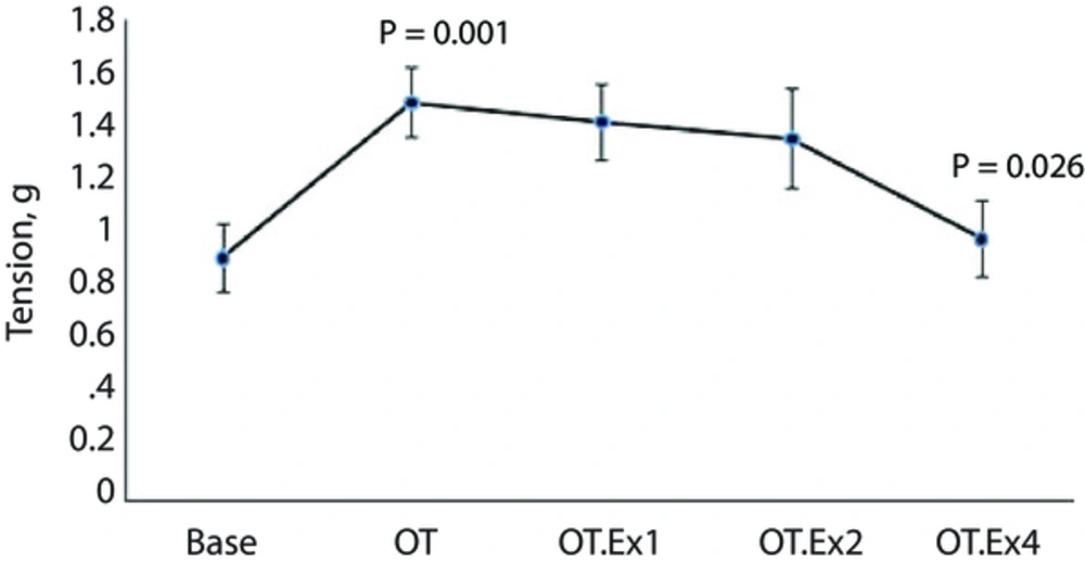 In the oxytocin group, the vehicle of oxytocin had no significant effect on the basal uterine smooth muscle contractions, but oxytocin (4 mU/mL) increased uterine contractions significantly from 0.91 g to 1.49 g (P = 0.001, Figure 2). Then, the cumulative extract of R. damascena was added to the organ bath in stepwise increasing concentrations: 1, 2, and 4 mg/mL; R. damascena (4 mg/mL) reduced uterine contractions induced by oxytocin (P = 0.026, Figure 3).