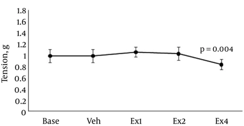 At first, basal smooth muscle contractions of the isolated virgin uterine horn were recorded. Then, either vehicle or alcoholic extract of R. damascena was added to the organ bath in stepwise increasing concentrations of 1, 2, and 4 mg/mL with 1-minute intervals. Vehicle and lower concentrations of the extract had not significant effects on the basal uterine contractions; however, R. damascena (4 mg/mL) reduced uterine contraction significantly compared to the base and lower concentrations of the extract (P = 0.004, Figure 2).