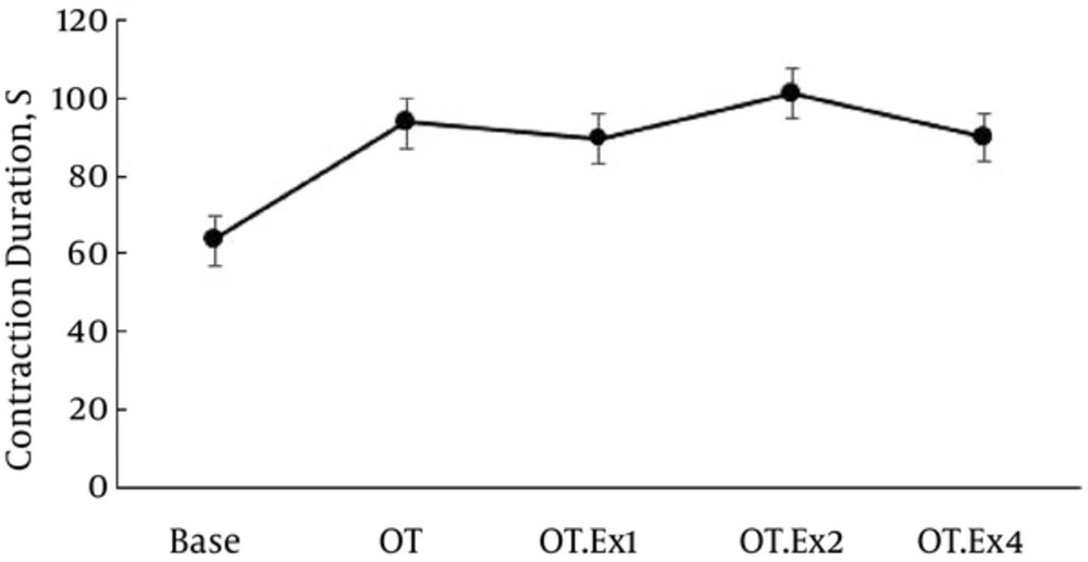 Oxytocin increased the duration of contraction in uterine smooth muscle, but it has not any significant difference with basal duration. Extracts of R. damascena were added to the chamber solution in stepwise increasing concentrations of 1, 2 and 4 mg/mL with a 1-minute interval. The Rose extract had no significant effect on the duration of uterine contractions induced by oxytocin (Figure 7).