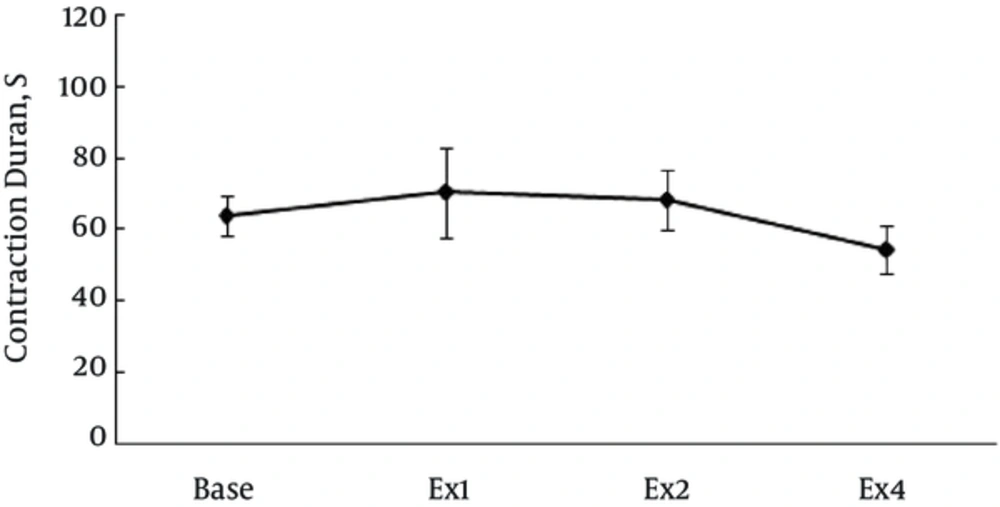 In the beginning, the basal uterine contractions were recorded. Then, either vehicle or alcoholic extract of R. damascena was added to the organ bath in stepwise increasing concentrations of 1, 2, and 4 mg/mL with a 1-minute interval. Neither vehicle nor extracts had significant effects on the duration of contraction (Figure 6).