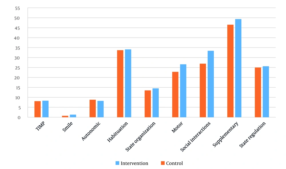 In the intervention group, significant improvements occurred in habituation, state regulation, social interactions, autonomic system, motor items, and supplementary items, with non-significant changes in state organization and smile.