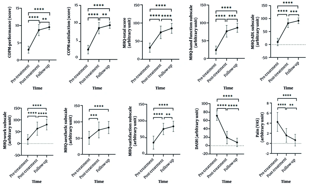 Moreover, reductions in pain based on VAS and MHQ pain subscale and hand disability based on DASH were observed in both groups after therapy and at follow-up compared to before therapy. The main effect of time (before therapy, after therapy, and follow-up for variables with three time-point assessments: Occupational performance and satisfaction, hand function, hand disability, and pain; and after therapy and follow-up for variables with two time-point assessments: Hand dexterity, TAM, power grip, and pinch was significant in all primary and secondary outcomes (P < 0.001) (Figures 3 and 4). The data reveal a consistent pattern of improvement in occupational performance/satisfaction, hand function, disability reduction, and pain relief. Both groups demonstrated enhanced outcomes post-treatment relative to baseline, with these improvements sustained through follow-up, suggesting durable therapeutic effects (Figure 3).